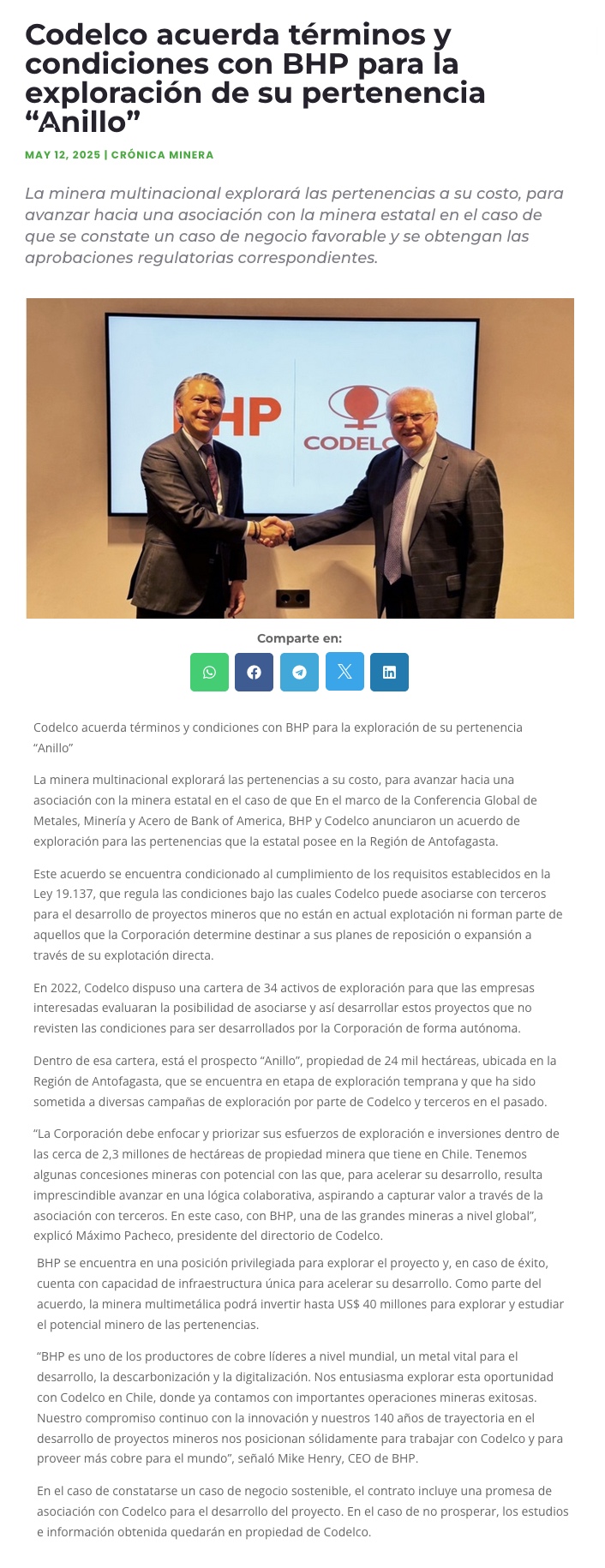 Codelco acuerda términos y condiciones con BHP para la exploración de su pertenencia “Anillo” - (nuevaminería online)