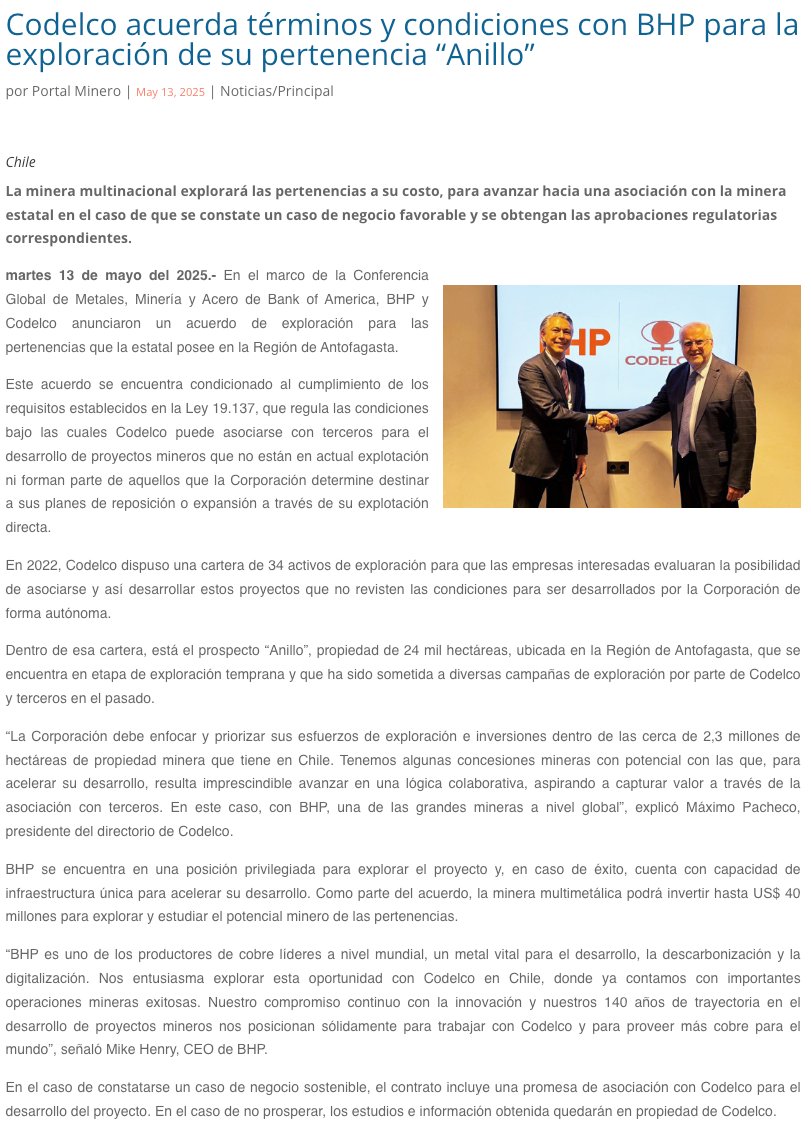 Codelco acuerda términos y condiciones con BHP para la exploración de su pertenencia “Anillo” - (electromineria.cl)