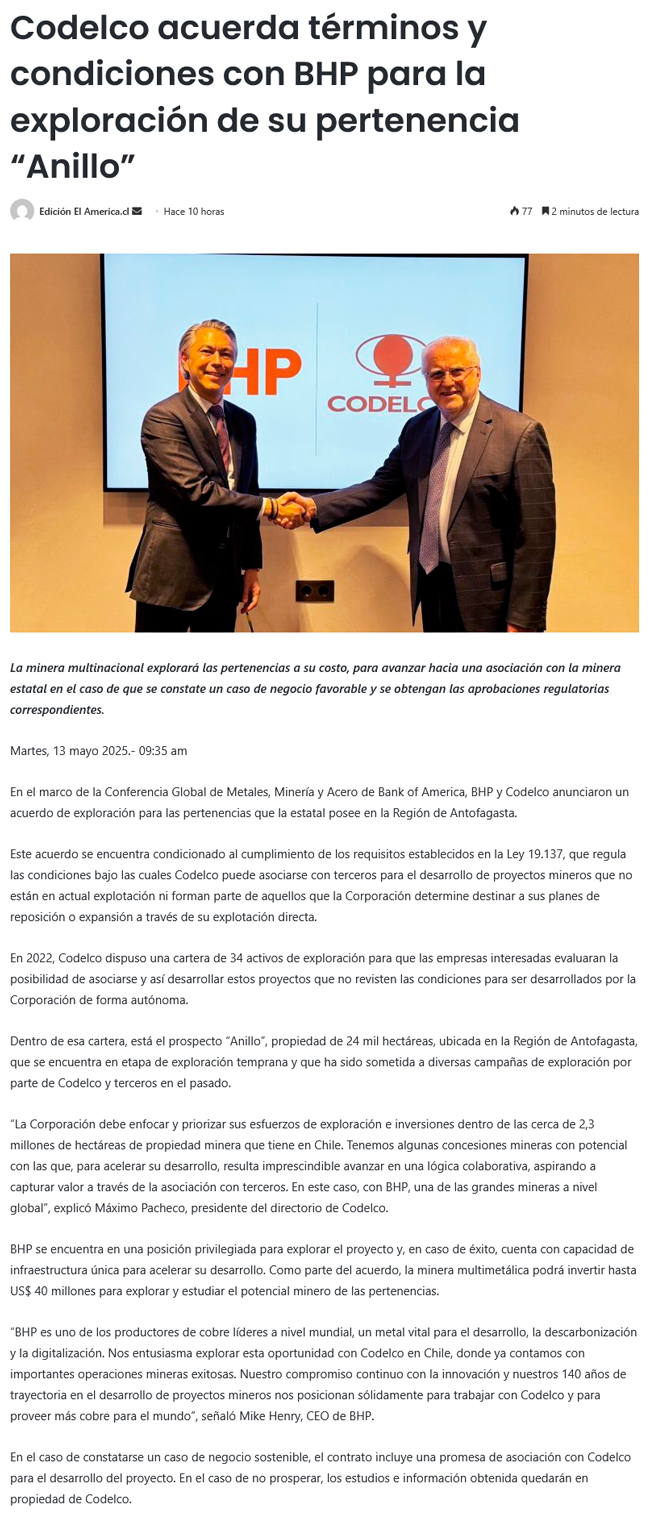 Codelco y BHP avanzan en exploración conjunta de proyecto “Anillo” en Antofagasta - (mineriayfuturo.cl)
