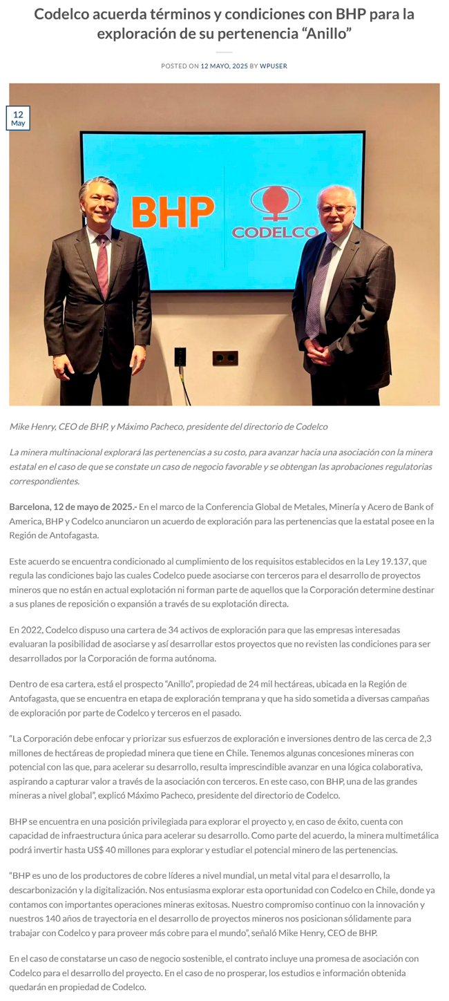 Codelco y BHP avanzan en exploración conjunta de proyecto “Anillo” en Antofagasta - (mineriayfuturo.cl)