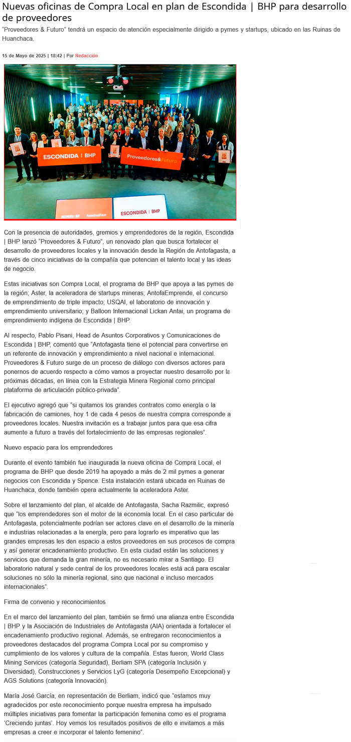 Escondida | BHP lanza “Proveedores & Futuro” para potenciar el emprendimiento y la innovación en Antofagasta - (madero.cl)