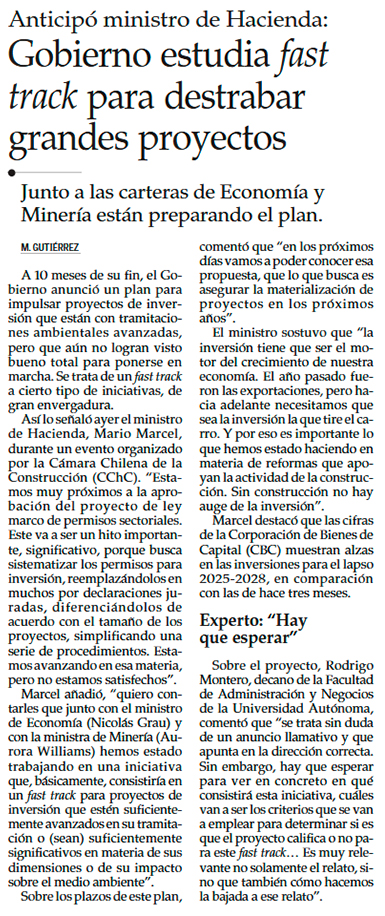Hacienda anuncia fast track para proyectos de inversión - (Diario Financiero)