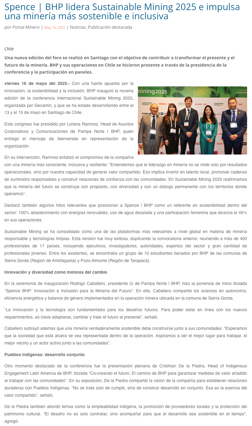 Spence | BHP lidera Sustainable Mining 2025 e impulsa una minería más sostenible e inclusiva - (portalinnova.cl)