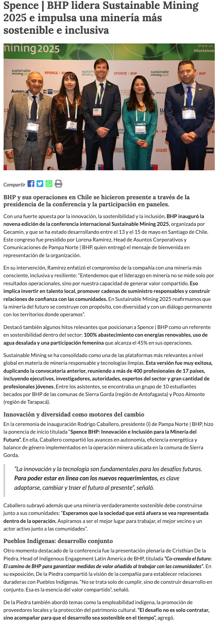 Spence | BHP lidera Sustainable Mining 2025 e impulsa una minería más sostenible e inclusiva - (portalinnova.cl)