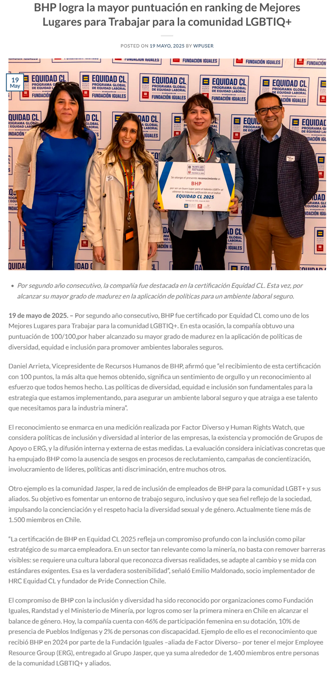 BHP es uno de los mejores lugares para trabajar para la comunidad LGBTIQ+ - (revistacrisol.cl)