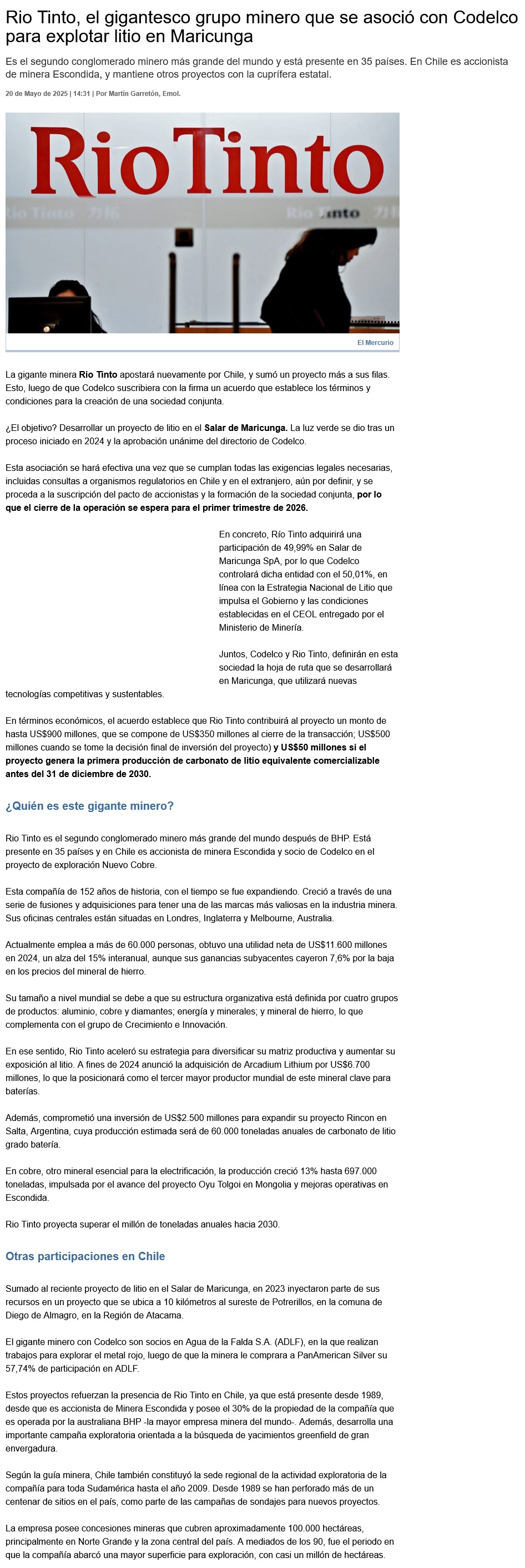 Codelco elige a Rio Tinto como socio para el desarrollo de proyecto de litio en el Salar de Maricunga - (redimin)