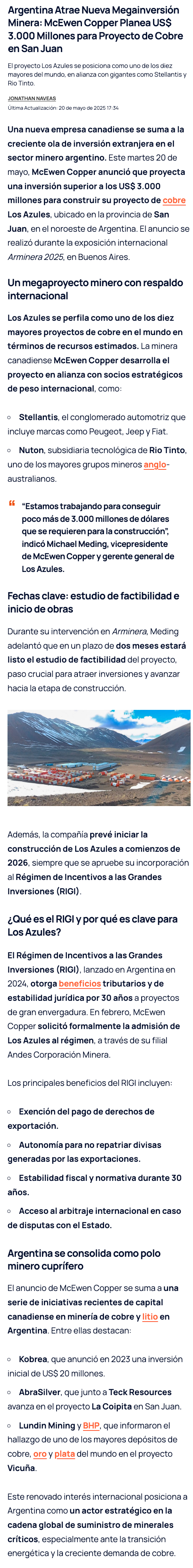 Nuevamente una empresa canadiense informa megainversión en minería del cobre en Argentina - (biobiochile online)