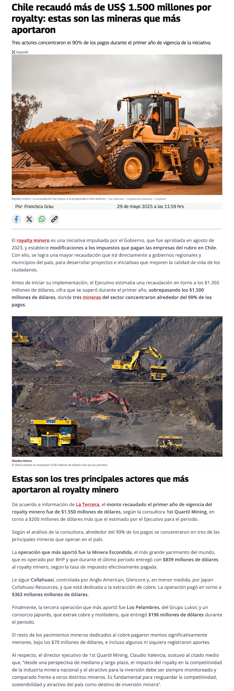 Royalty minero recaudó más de US$1.550 millones en su primer año de vigencia - (puranoticia.cl)