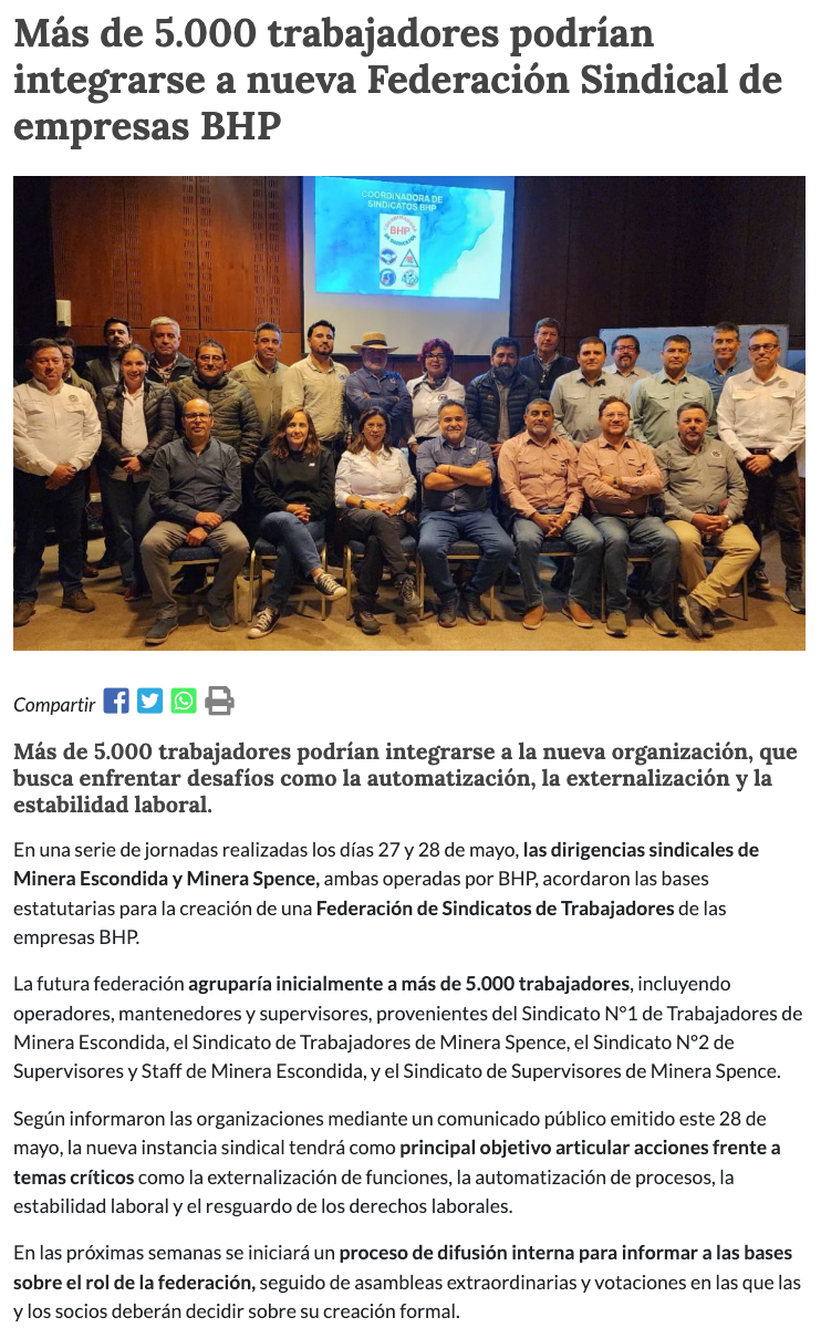 Desde Antofagasta: Sindicatos de Escondida y Spence impulsan federación interempresas de BHP para fortalecer diálogo laboral - (diarioantofagasta)