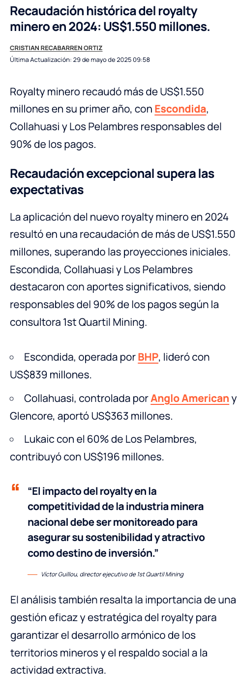 Royalty minero recaudó más de US$1.550 millones en su primer año de vigencia - (puranoticia.cl)