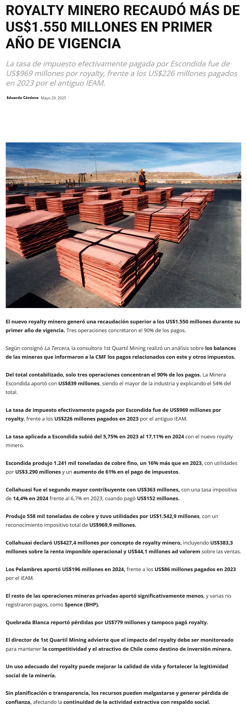 Royalty minero recaudó más de US$1.550 millones en su primer año de vigencia - (puranoticia.cl)