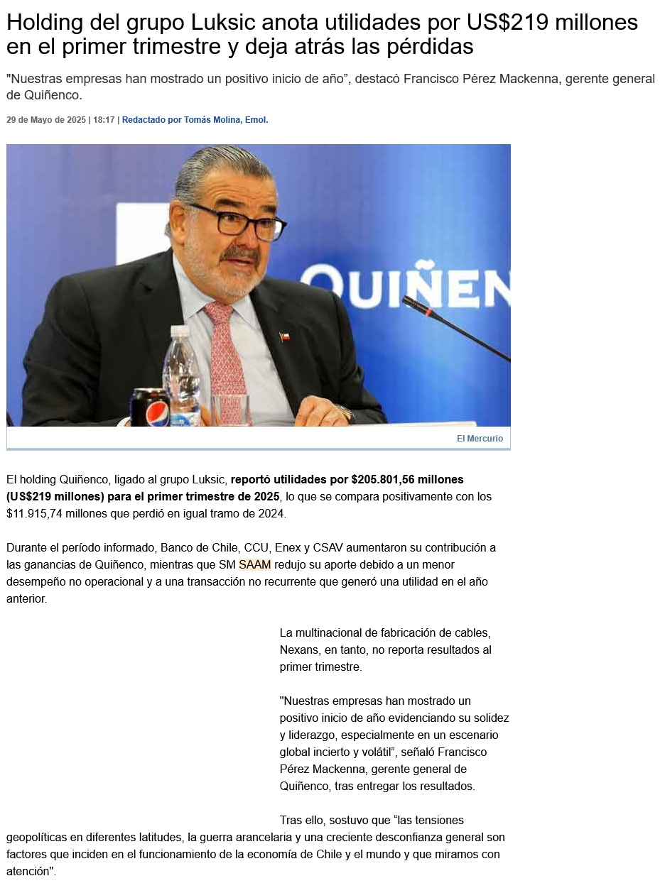Quiñenco deja atrás las pérdidas y reporta ganancias por US$ 219 millones en el primer trimestre - (DF Online)