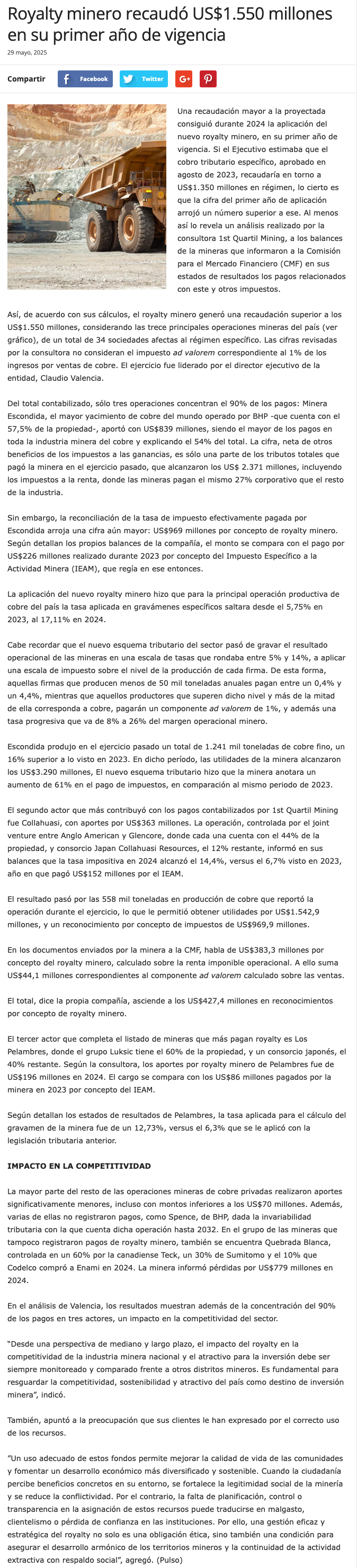 Royalty minero recaudó más de US$1.550 millones en su primer año de vigencia - (puranoticia.cl)