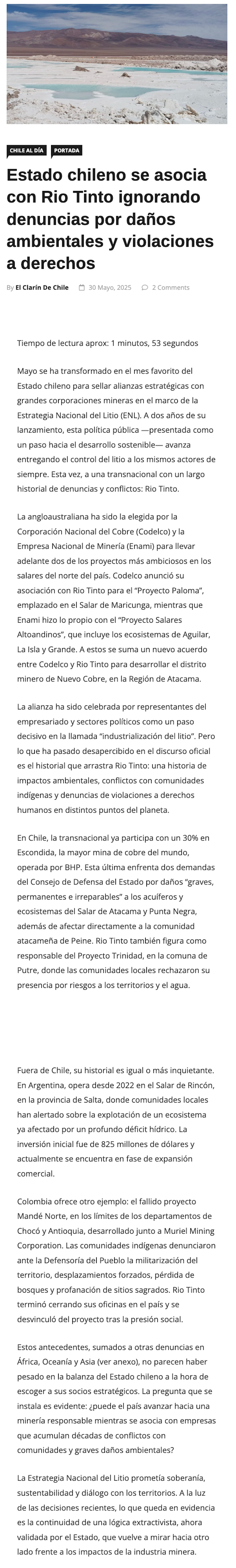 Alianza del Estado chileno con Rio Tinto para explotar litio desata críticas por historial ambiental de la transnacional - (elciudadano)