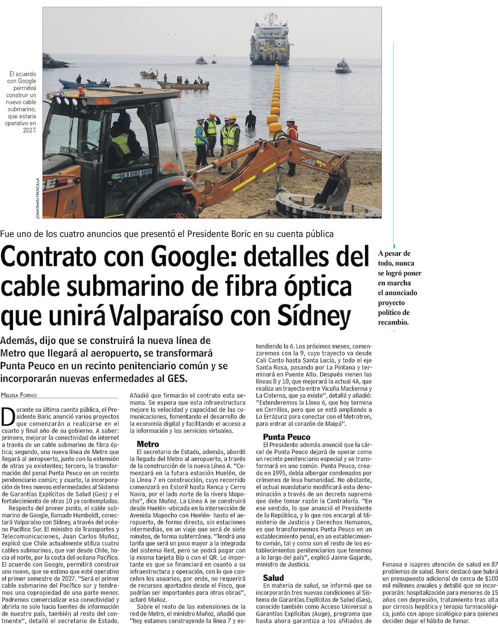 Gobierno y Google firmará este miércoles contrato del cable de Humboldt - (Diario Financiero)