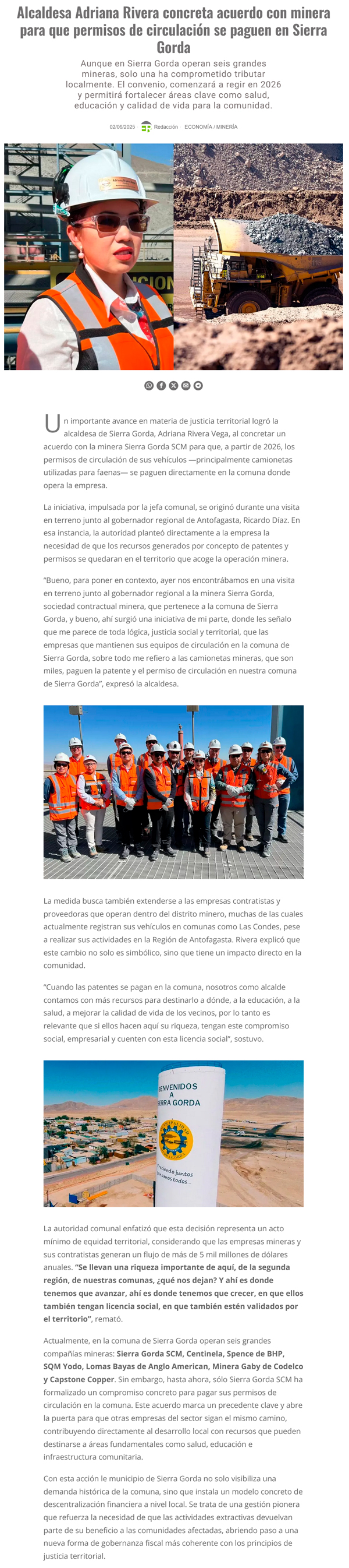 Alcaldesa de Sierra Gorda concretó acuerdo con minera para que permisos de circulación se paguen en la comuna - (calamaenlinea.cl)