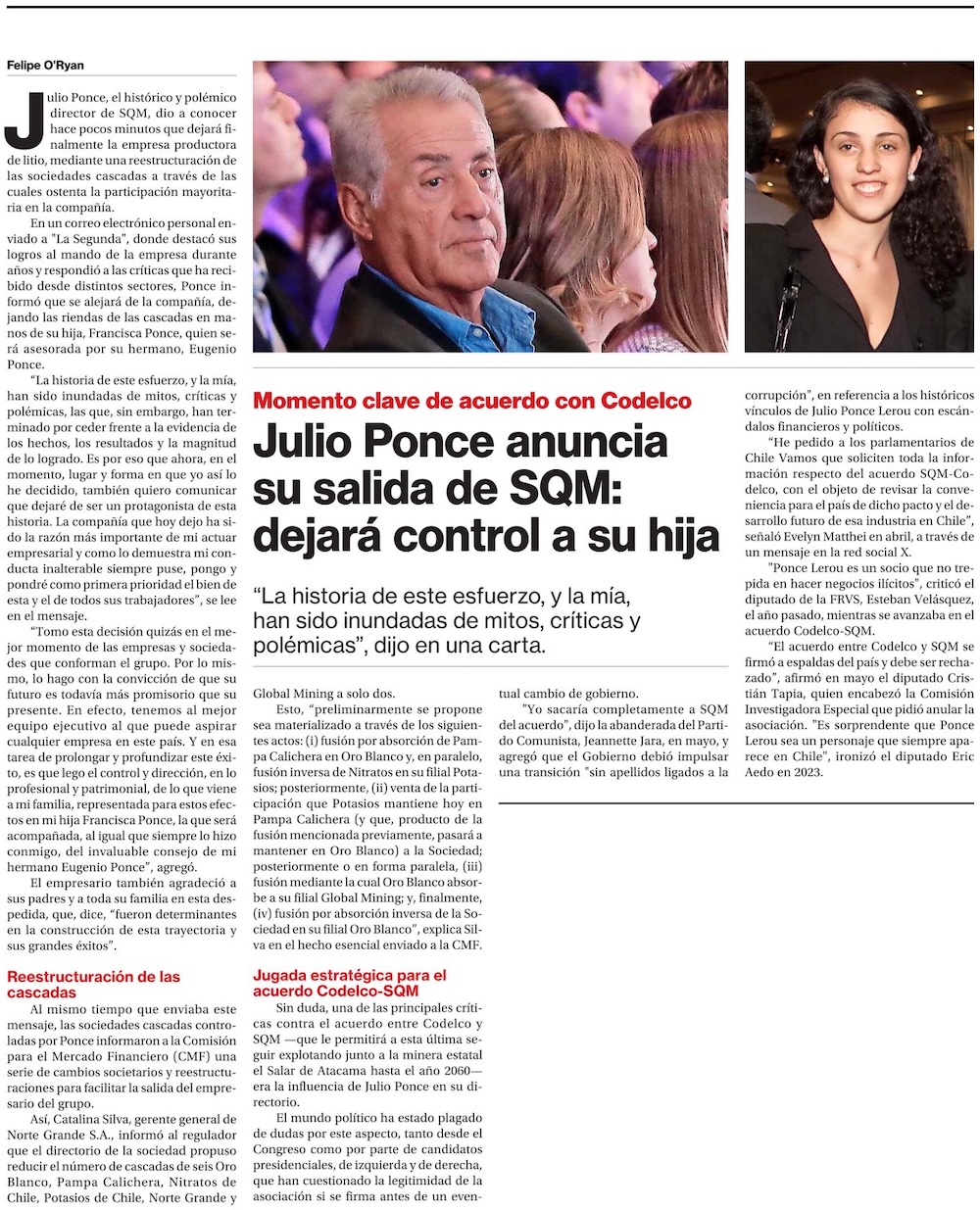 Fin de un ciclo en SQM: Ponce cede control a su hija Francisca y se reordenan las sociedades - (El Mercurio de Santiago)