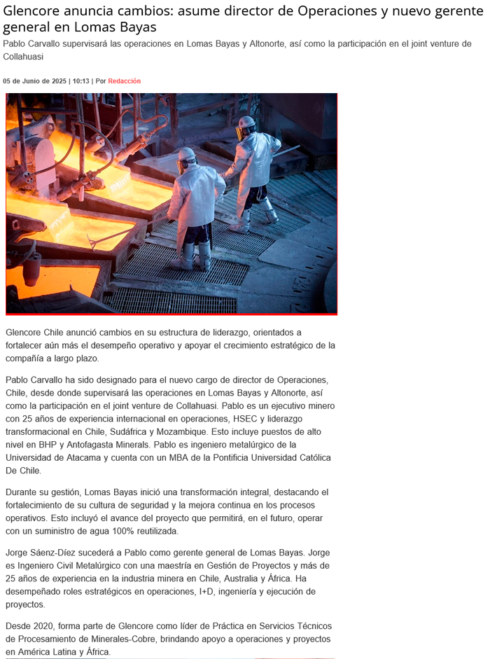 Glencore Chile anuncia nueva estructura de liderazgo: Pablo Carvallo asume como Director de Operaciones y Jorge Sáenz-Diez es designado Gerente General de Lomas Bayas - (portalinnova.cl)