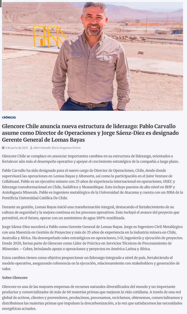 Glencore Chile anuncia nueva estructura de liderazgo: Pablo Carvallo asume como Director de Operaciones y Jorge Sáenz-Diez es designado Gerente General de Lomas Bayas - (portalinnova.cl)