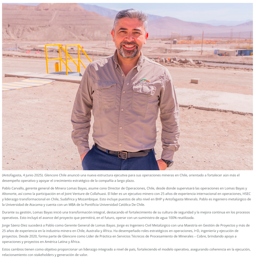 Glencore Chile anuncia nueva estructura de liderazgo: Pablo Carvallo asume como Director de Operaciones y Jorge Sáenz-Diez es designado Gerente General de Lomas Bayas - (diarioangamos)
