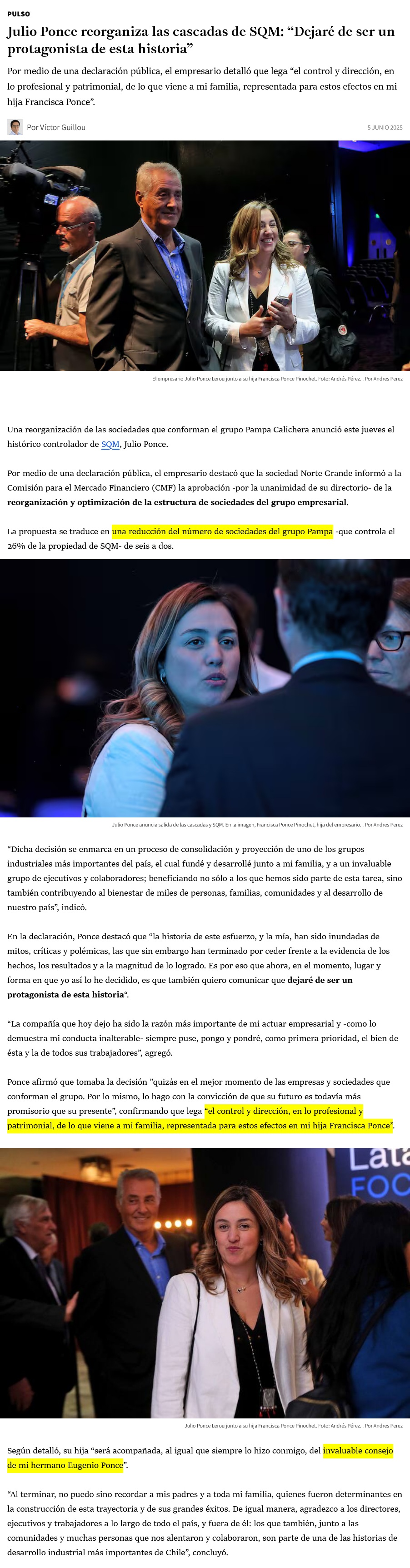 Julio Ponce fusiona las cascadas de SQM y formaliza traspaso de mando a su hija: “Dejaré de ser protagonista de esta historia” - (Pulso)