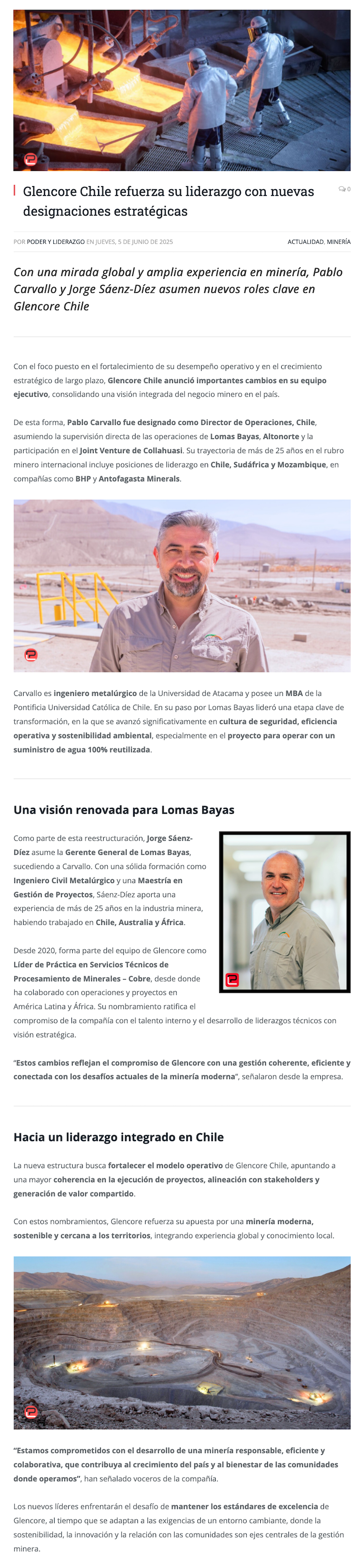 Glencore Chile anuncia nueva estructura de liderazgo: Pablo Carvallo asume como Director de Operaciones y Jorge Sáenz-Diez es designado Gerente General de Lomas Bayas - (portalinnova.cl)
