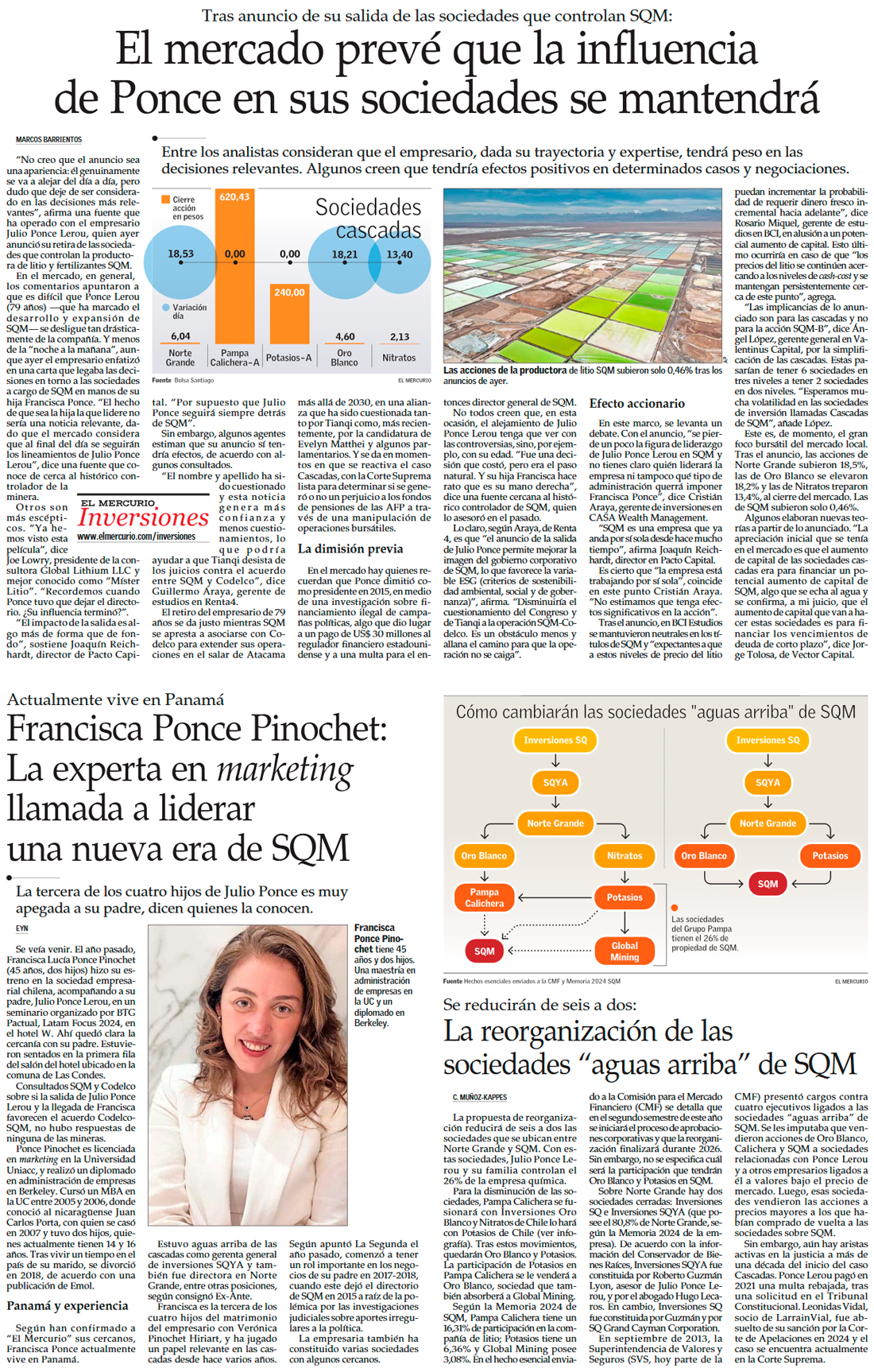Fin de un ciclo en SQM: Ponce cede control a su hija Francisca y se reordenan las sociedades - (El Mercurio de Santiago)