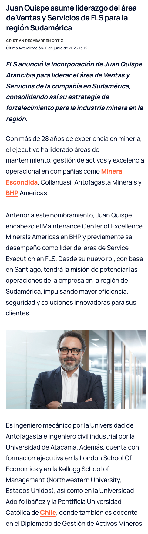 Juan Quispe asume liderazgo del área de Ventas y Servicios de FLS para la región Sudamérica - (nuevaminería online)