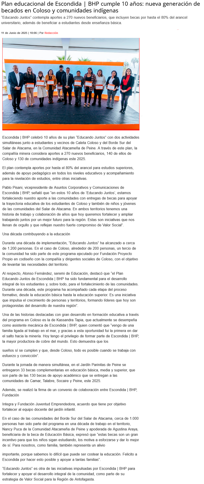 Escondida | BHP celebra 10 años de “Educando Juntos”: 270 nuevos estudiantes de Coloso y comunidades indígenas serán beneficiados - (antofagastaaldia.cl)