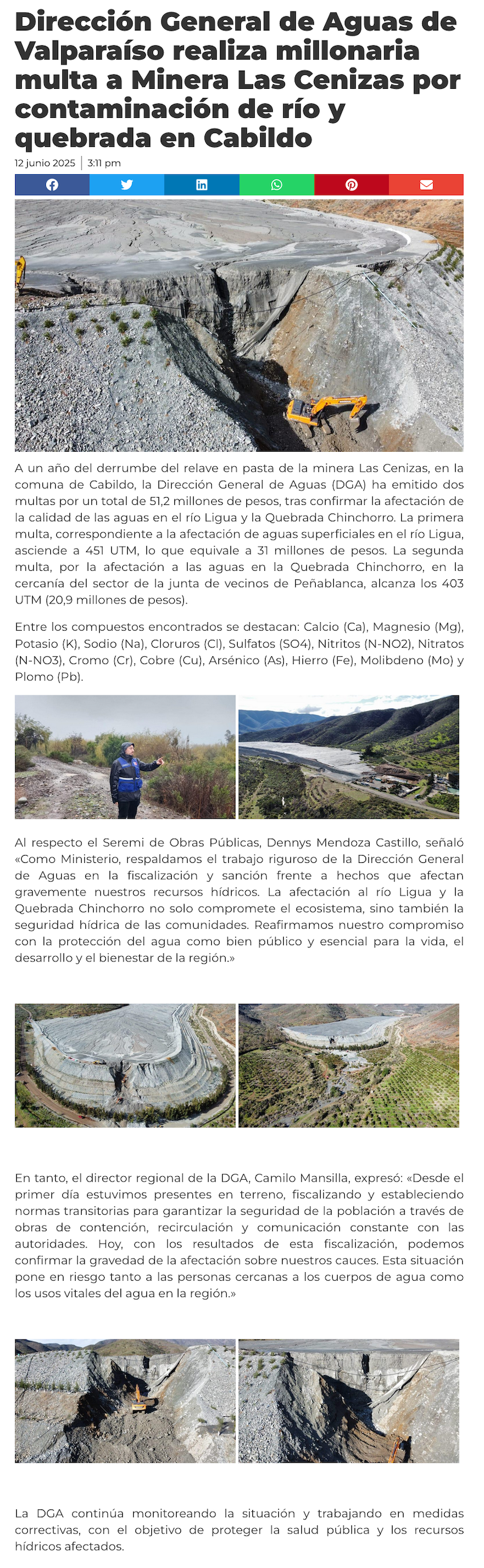 A un año de derrumbe de relave en Cabildo, DGA aplica dos multas a Minera Las Cenizas - (El Mercurio de Valparaíso)