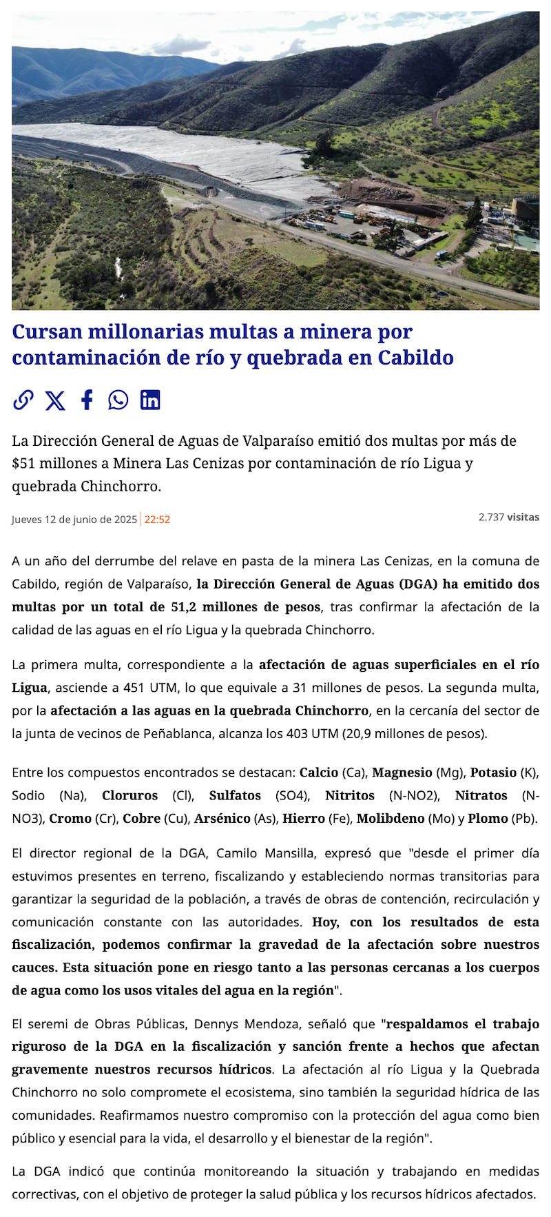 Dirección General de Aguas de Valparaíso realiza millonaria multa a Minera Las Cenizas por contaminación de río y quebrada en Cabildo - (g5noticias.cl)