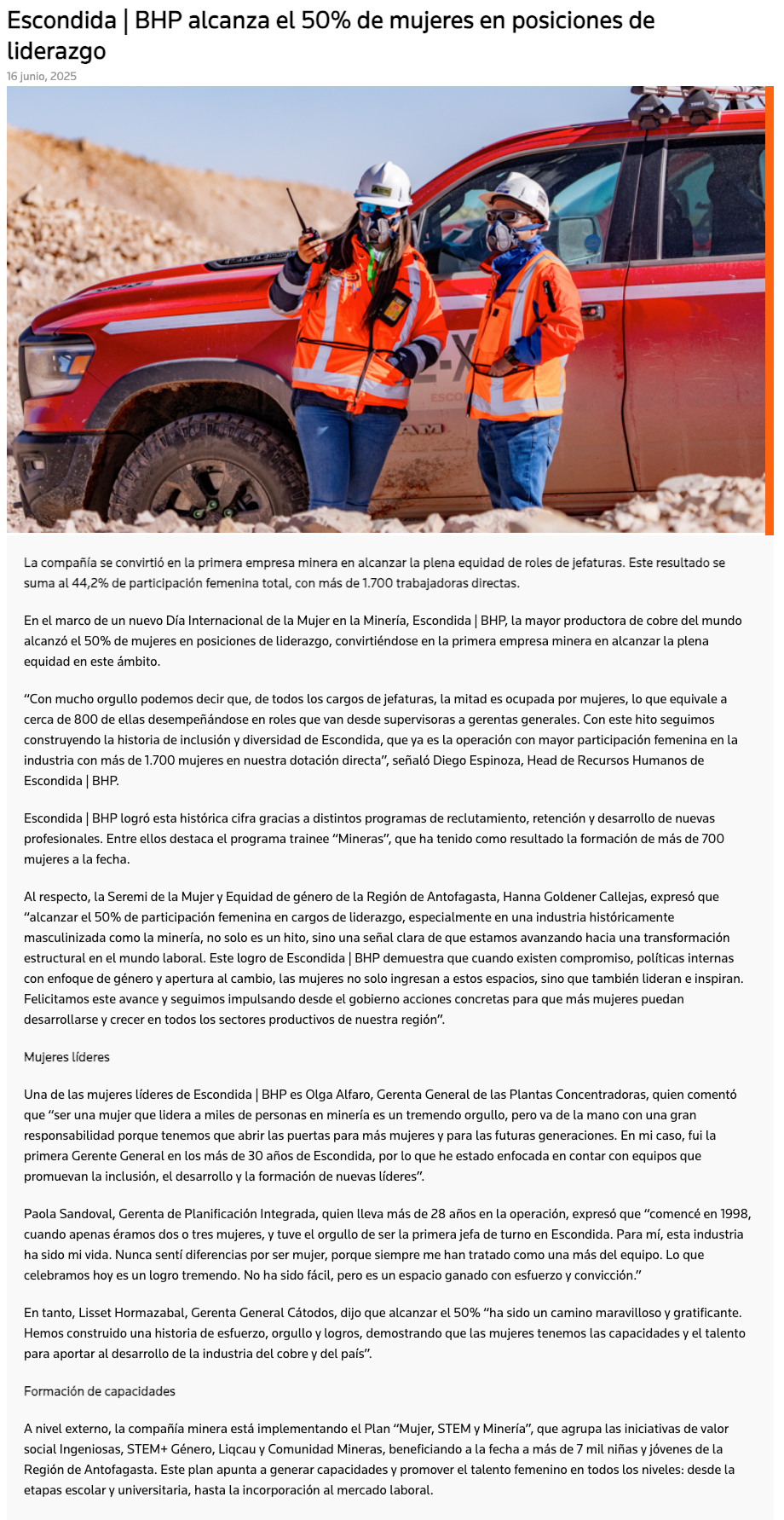 Escondida | BHP alcanza el 50% de mujeres en cargos de liderazgo y marca un nuevo hito en inclusión minera - (mineriayfuturo.cl)