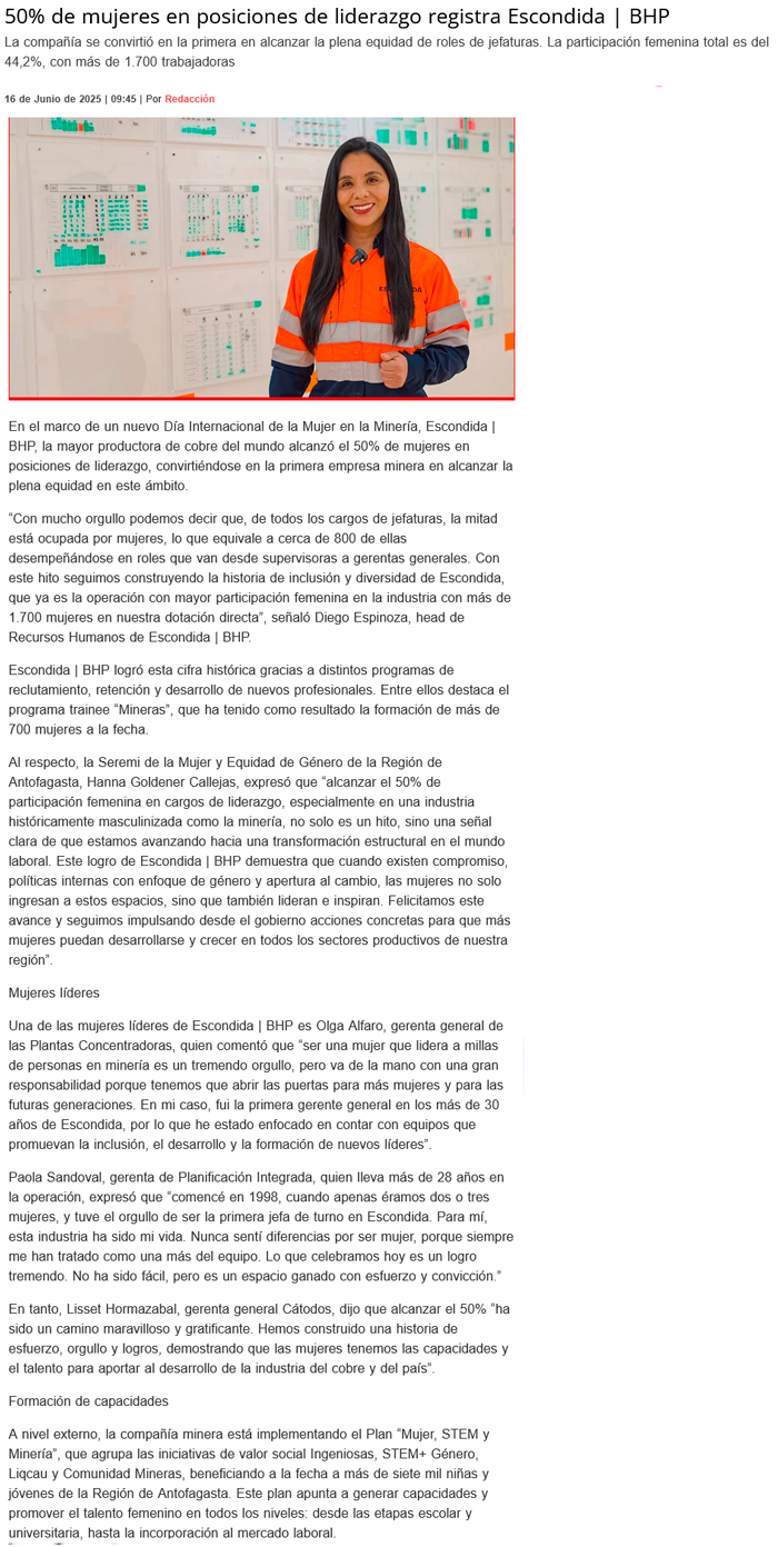 Escondida | BHP alcanza el 50% de mujeres en cargos de liderazgo y marca un nuevo hito en inclusión minera - (mineriayfuturo.cl)
