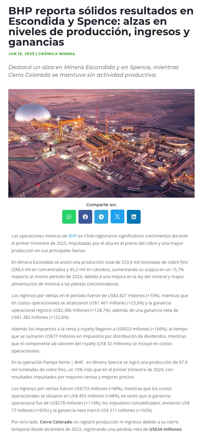 BHP reporta alza en producción y utilidades en Escondida y Spence durante el primer trimestre de 2025 - (mineriayfuturo.cl)