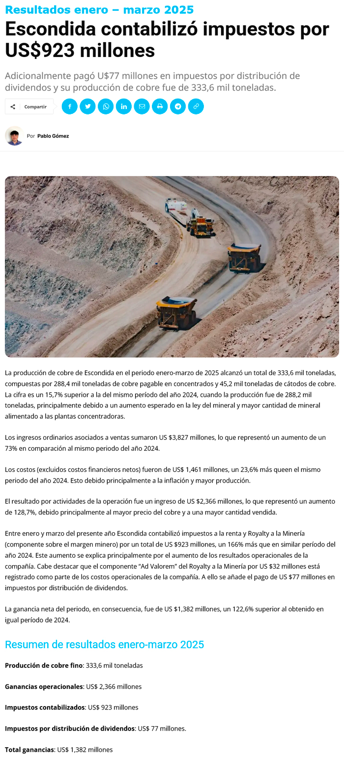 Alza de 116%: Escondida paga en impuestos y royalty US$923 millones en enero-marzo 2025 - (soyantofagasta)