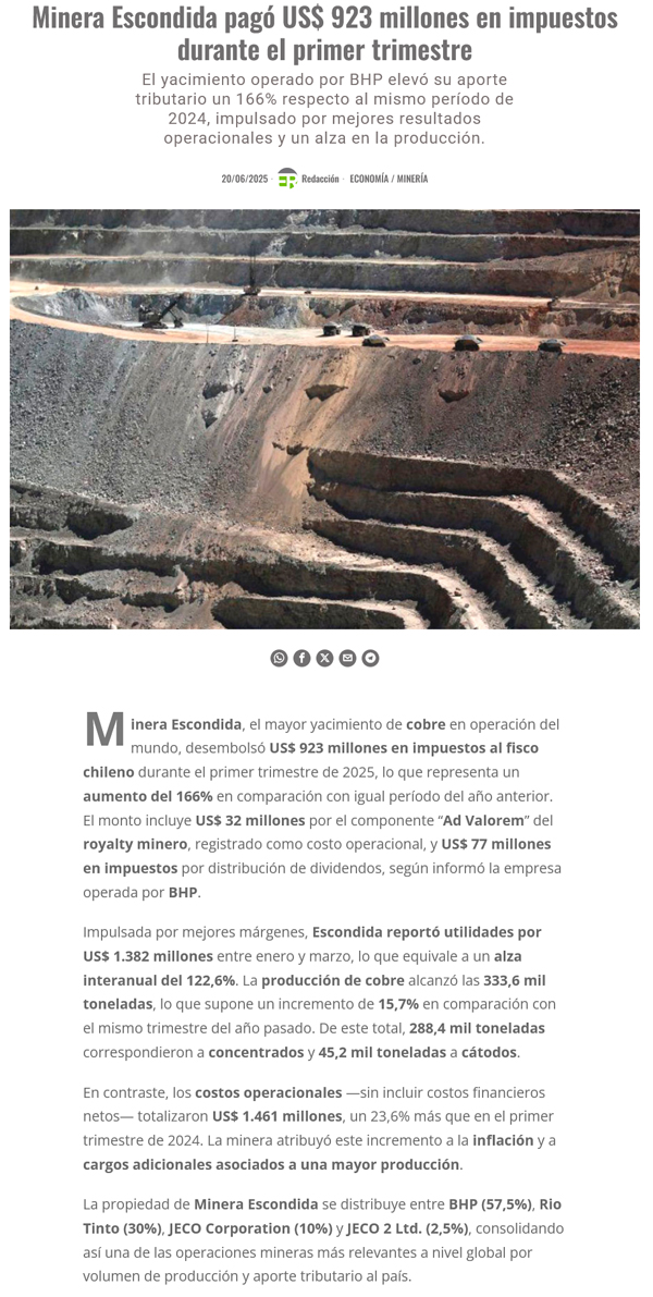 Alza de 116%: Escondida paga en impuestos y royalty US$923 millones en enero-marzo 2025 - (soyantofagasta)