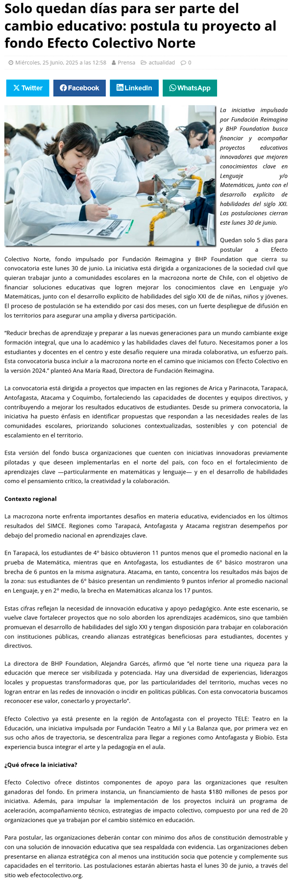 Solo quedan días para ser parte del cambio educativo: postula tu proyecto al fondo Efecto Colectivo Norte - (regionesnoticias.cl)