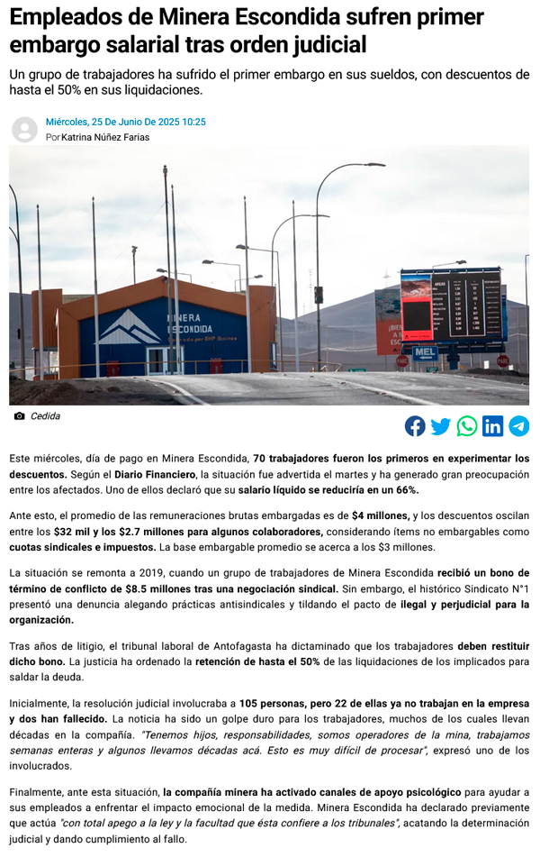 Trabajadores de Minera Escondida enfrentan primer embargo millonario por devolución de bono - (calamaenlinea.cl)
