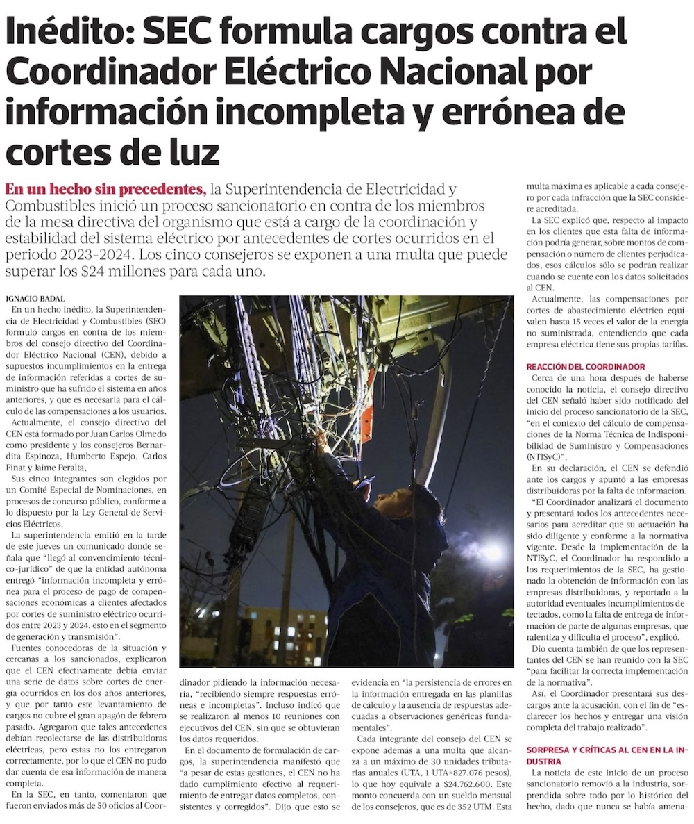 Por primera vez, SEC apunta al Coordinador Eléctrico por datos erróneos - (El Mercurio de Santiago)
