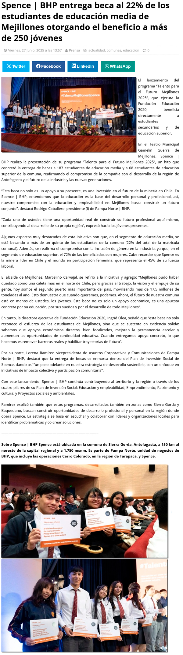 Spence | BHP entrega beca al 22% de los estudiantes de educación media de Mejillones otorgando el beneficio a más de 250 jóvenes - (regionesnoticias.cl)