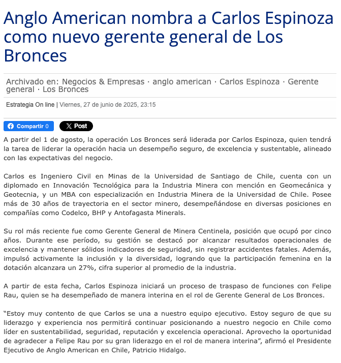 Anglo American nombra a Carlos Espinoza como nuevo gerente general de Los Bronces - (g5noticias.cl)