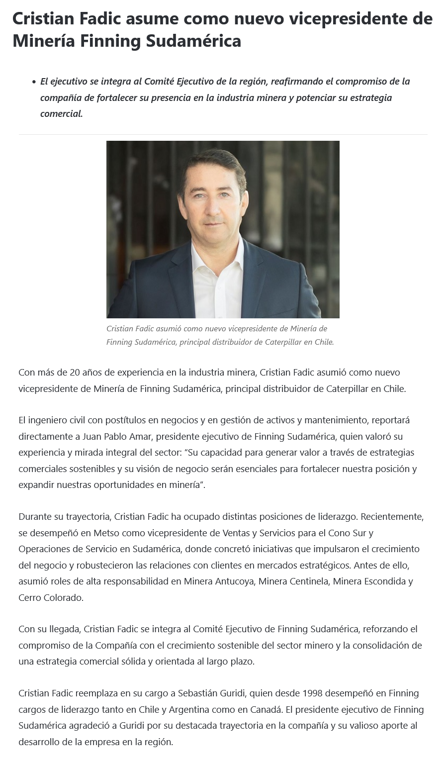 Ingeniero Cristian Fadic asumió Vicepresidencia Mineria en FINNING SUDAMÉRICA - (revistacrisol.cl)