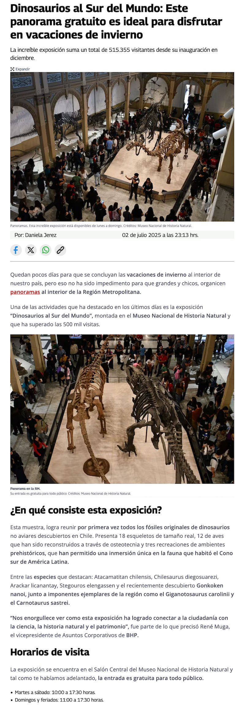 BHP y panorama imperdible y gratuito en las vacaciones de invierno: Dinosaurios al Sur del Mundo - (guiaminera.cl)