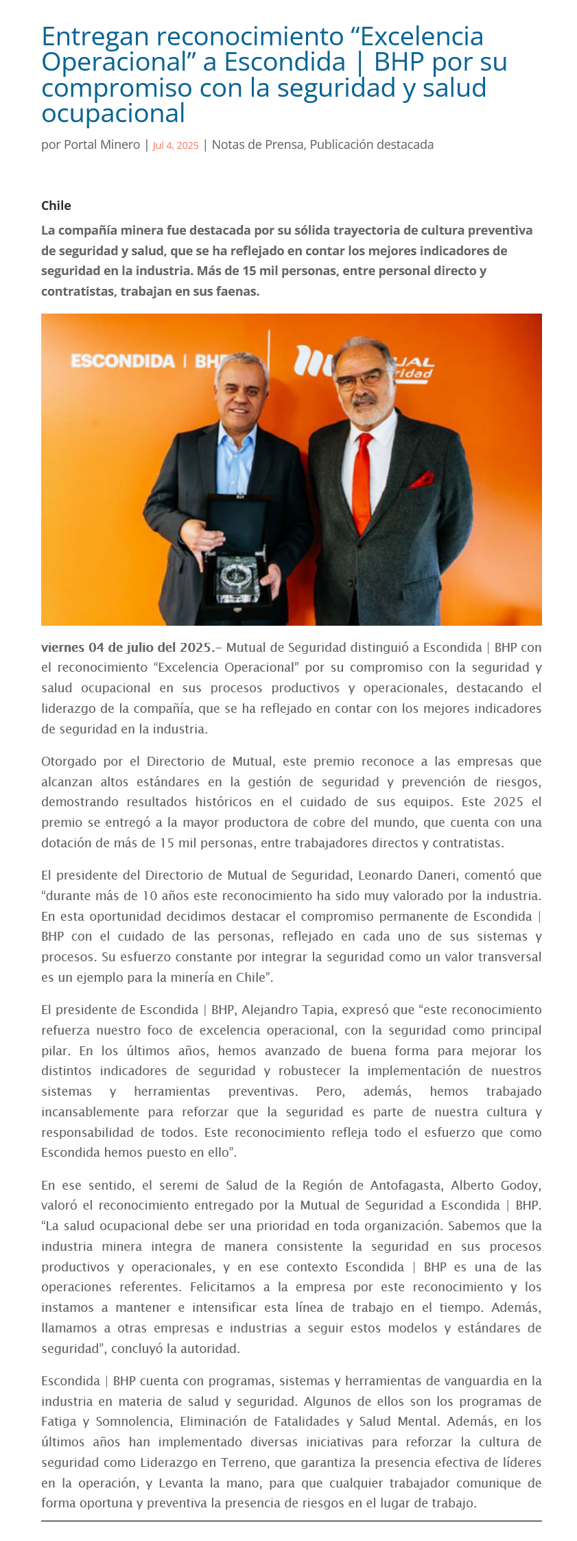 Mutual de Seguridad entregó reconocimiento “Excelencia Operacional” a Escondida BHP - (nuevaminería online)