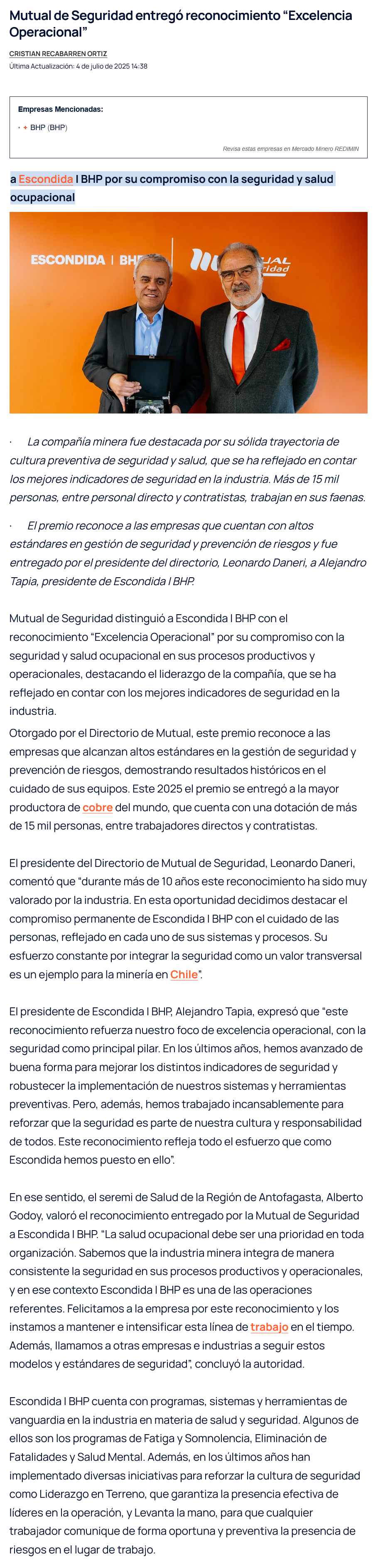 Mutual de Seguridad entregó máximo reconocimiento en seguridad y salud ocupacional a nivel nacional a Escondida | BHP - (El Mercurio de Antofagasta)