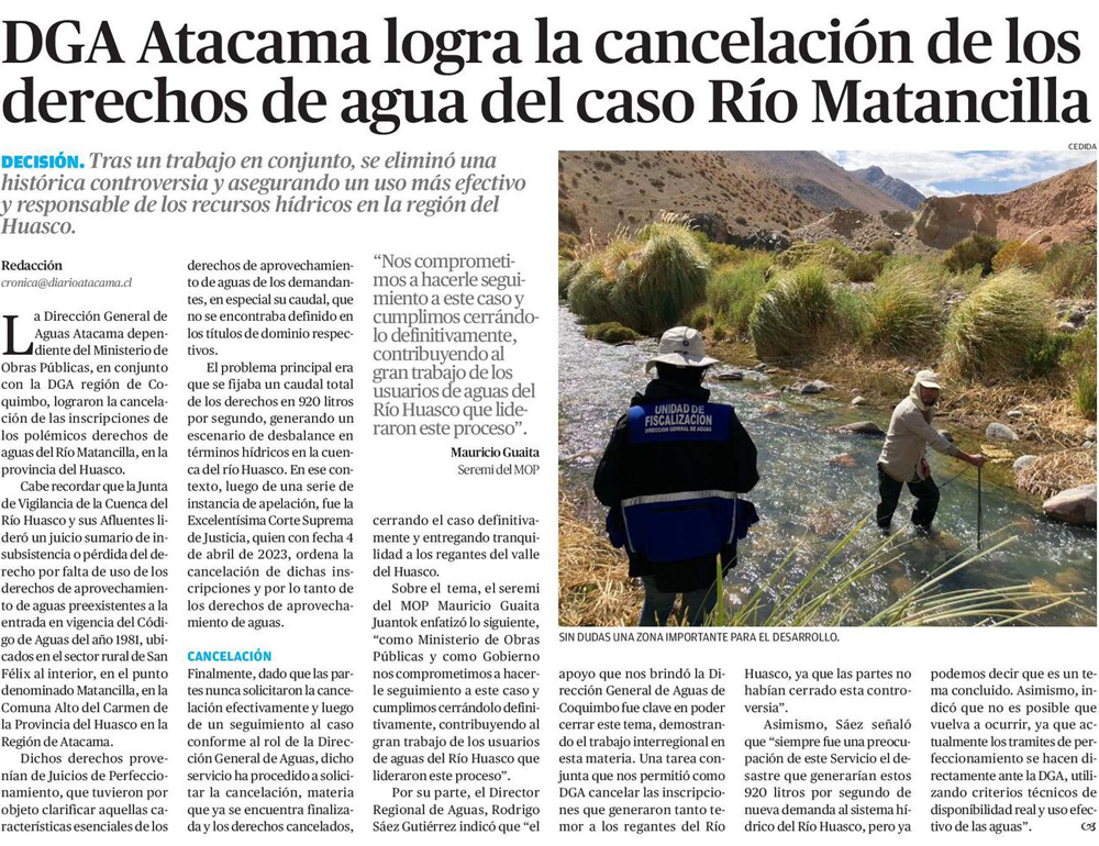 Logran cancelación de derechos de agua del caso río Matancilla en la cuenca del Huasco - (El Noticiero del Huasco)