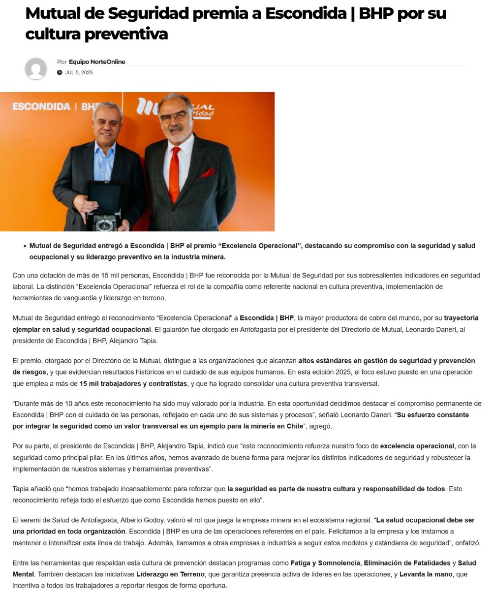 Mutual de Seguridad entregó reconocimiento “Excelencia Operacional” a Escondida BHP - (nuevaminería online)