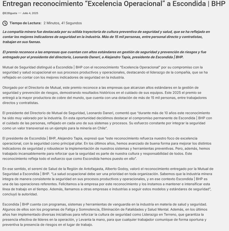 Mutual de Seguridad entregó reconocimiento “Excelencia Operacional” a Escondida BHP - (nuevaminería online)