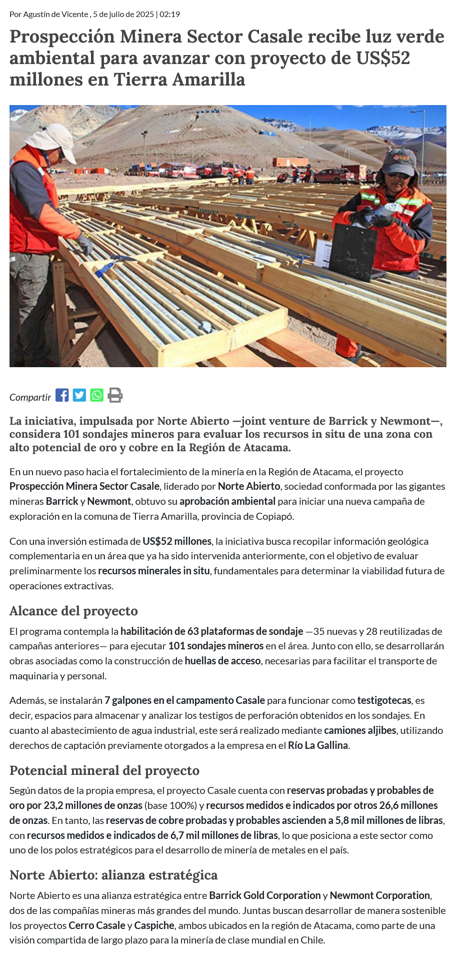 Prospección Minera Sector Casale obtuvo aprobación ambiental para impulsar proyecto de US$52 millones - (electromineria.cl)