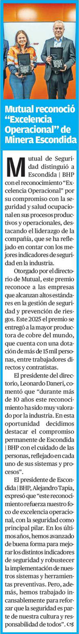 Reconocen a Minera Escondida por su excelencia operacional - (El Mercurio de Antofagasta)